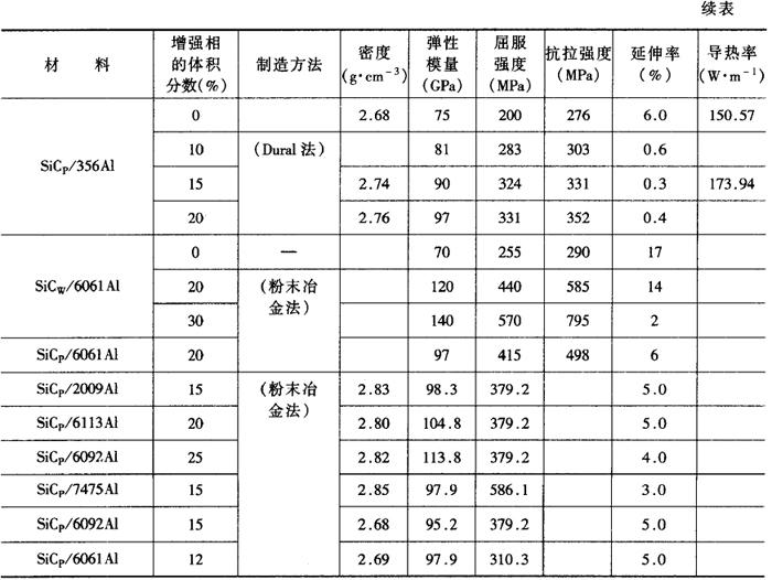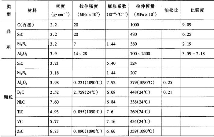 | 释义 | 非连续增强金属基复合材料 非连续增强金属基复合材料既保持了连续纤维增强金属基复合材料的优良性能,又具有价格低廉、生产工艺和设备简单、各向同性等优点,而且可采用传统的金属二次加工技术和热处理强化技术进行加工。因此在民用工业中比纤维增强金属基复合材料具有更大的竞争力。因此,目前这种材料发展迅速,应用较为广泛。 非连续增强金属基复合材料包括晶须增强金属基复合材料、颗粒增强金属基复合材料、短纤维增强金属基复合材料等几种。其增强相包括单质元素(如石墨、硼、硅等)、氧化物(如Al2O3、TiO2、SiO2、ZrO2等)、碳化物(SiC、B4C、TiC、VC、ZrC等)、氮化物(Si3N4、BN、AIN等)的颗粒、晶须及短纤维(分别以下标p、w、sf表示)。常用的增强颗粒及晶须的性能见表2-10-4。 表2-10-4 常用增强颗粒及晶须的性能