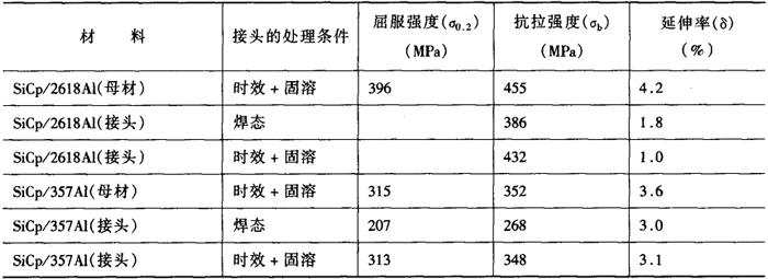 2.钎焊 并不是所有能钎焊Al合金的钎料均可用来钎焊Al基复合材料,这主要是因为,钎焊复合材料时不但要求对基体金属有良好的润湿性,还要能够润湿增强相颗粒或晶须。而且,要求钎焊温度尽量低,避免热循环对增强颗粒或晶须的影响。Al-Si、Al-Ge和Zn-Al这几种铝合金用钎料对SiCw/6061Al、SiCp/LD2等均具有较好的润湿性,均可钎焊这些复合材料。其主要问题是熔化的Al-Si、Al-Ge钎料中的Si或Ge易向复合材料基体中扩散,破坏母材原有的组织结构。 在钎焊的保温过程中,Si或Ge向复合材料基体中扩散,随着基体金属扩散区内含Si或Ge量的提高,其液相线温度相应降低。当其液相线温度降至钎焊温度时,母材中的扩散区发生局部熔化,在随后的冷却凝固过程中SiC颗粒或晶须被推向尚未凝固的焊缝两侧,在此处形成富SiC层,使复合材料的组织遭到破坏,原来均匀分布的组织分离为由富SiC区和贫SiCw区所组成的层状组织,而且在贫SiC区内含有来自共晶合金的高浓度的Si和Ge,使接头性能降低。比较而言,Zn-Al共晶与复合材料之间的相互作用较小,Zn向基体金属中的扩散程度较低。 研究表明,钎料与复合材料之间的相互作用与复合材料的加工状态有关,在经挤压和交叉轧制的SiCw/6061Al复合材料中,Si和Ge的扩散深度及程度较大,但在未经过二次加工的同一种复合材料的热压坯料中,Si和Ge的扩散深度及程度很小,不会引起复合材料组织的变化[7]。这可能是因为,复合材料经过挤压和交叉轧制加工后,基体中的位错密度增大,这些位错与层错及晶界一起为Si及Ge原子的扩散提供了快速扩散通道。 在钎焊这类复合材料时必须对钎焊参数进行优化设计,正确匹配钎焊温度及保温时间。 3.摩擦焊 摩擦焊是利用摩擦产生的热量及顶锻压力下产生的塑性流变来实现焊接的焊接方法,整个焊接过程中母材不发生熔化,因此是一种焊接SiCp/Al、Al2O3p/Al等颗粒增强型复合材料的理想方法。由于被焊接表面附近需要发生较多的塑性变形,因此用这种方法焊接纤维增强型复合材料是不合适的。 对于颗粒增强金属基复合材料,由于颗粒的尺寸细小,摩擦焊过程中基体金属发生塑性流动时,颗粒可随基体金属同时发生移动,因此焊接过程一般不会改变粒子的分布特点。焊缝中粒子分布非常均匀,体积分数与母材中粒子的体积分数极为相近,而且由于在摩擦焊过程中界面上的颗粒被相互剧烈碰撞所破碎,焊缝中增强相颗粒还会变细,增强效果加强。研究表明[13],母材的加工状态及焊后的热处理规范对接头的强度具有很大的影响,对于经T6处理的SiCp/357Al,由于焊接过程中β”-Mg2Si粒子的大量溶解,焊缝的强度及硬度明显下降,但经焊后T6热处理后,焊缝强度及硬度又恢复到母材的水平。而对于经T3回火处理的SiCp/357Al复合材料,由于晶粒的细化及位错密度的提高,焊缝的强度及硬度反而比母材有所提高。表2-10-10给出了两种铝基复合材料的典型力学性能。 表2-10-10 两种铝基复合材料的典型力学性能[7,12]