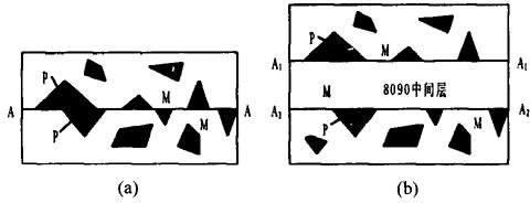 文献[14]对A12O3p/6061Al与6061-T6、5052-T4、2017T4等Al合金的摩擦焊进行了研究。发现焊缝中复合材料与Al合金发生了充分的机械混合,粒子的尺寸及基体金属的晶粒尺寸均比母材减小。焊接过程中复合材料中的粒子向Al合金中推移,移动的距离按6061、5052、2017的顺序增大。粒子的体积含量较低时,Al2O3p/6061Al热影响区的硬度比母材明显减小,而粒子含量较高时,Al2O3p/6061Al热影响区的硬度没有明显减小。 4.扩散焊 由于在Al的表面上存在一层非常稳定而牢固的氧化膜,它严重地阻碍了两连接表面之间的扩散结合。Al基复合材料的的直接扩散焊是很困难的,需要较高的温度、压力及真空度,因此多采用加中间层的方法进行。加中间层后,不但可在较低的温度和较小的压力下实现扩散连接,而且可将原来结合界面上的增强相-增强相(P-P)接触改变为增强相-基体(P-M)接触,如图2-10-13所示,从而提高了接头强度。这是由于P-P几乎无法结合,而P-M间可形成良好的结合,使接头强度大大提高。根据所选用的中间层,扩散焊方法有两种:采用中间层的固态扩散焊及瞬时液相扩散连接。