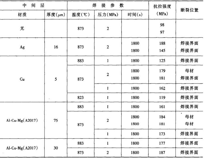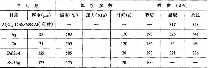 表2-10-12为利用不同中间层焊接的Al2O3sf-15%/6063Al复合材料接头的强度及其焊接参数。不加中间层时,尽管也能得到强度较高的接头,但工艺参数的选择范围非常窄。而利用Cu、2027Al或Ag中间扩散层时,在宽广的焊接工艺参数范围内均能得到接近母材性能的接头。 表2-10-12 利用不同中间层焊接的A12O3sf-15%/6063Al复合材料接头的强度及其焊接参数[10]