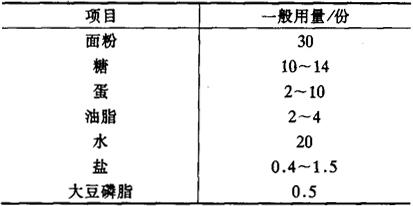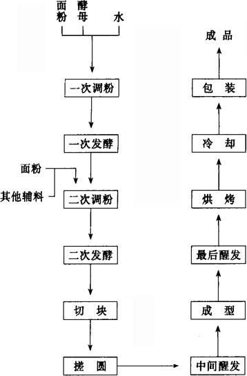 图1-9-19 面包制作(二次发酵法)工艺流程图 2.1 面团的调制与发酵 面团的调制与发酵是面包生产中的关键工序。国内生产面包目前有两种发酵方法,即一次发酵法和二次发酵法。 一次发酵法的特点是将配料中的全部原、辅材料顺序加入调粉机中进行一次性调制面团,在适当工艺条件下,面团经一次发酵,即可进行整形,烘烤等工艺操作。 二次发酵法的特点是将配方中的原、辅料按投料顺序分2次调制面团,2次发酵,然后再进行整形、烘烤等工艺操作。二次发酵法所需时间比一次发酵法稍长,但二次发酵的面团吸水充分,发酵完善,面包体积较大,内部蜂窝壁薄、柔软,面包老化速度慢。因为二次发酵具有以上优点,所以是目前应用最广的一种方法。这里主要介绍二次发酵法的工艺流程。 2.1.1 第一次调粉 先将温水放入调粉机,然后投入70%的面粉和酵母液一起搅拌,制成无生粉、生粉块、软硬均匀一致的面团。 加水量一般情况是占面粉重量的60%~65%。加水量过多,会使面团太软、太粘、造成机器分割、揉圆、整形等工序的困难;加水量过少,会导致面团发硬,造成面包组织粗糙,吃口不好的现象。水温控制冬季一般为45~50℃,夏季为20~28℃。 第一次调粉时间通常为5~7min左右,调制成面团的温度为27~28℃左右。 第一次调粉所需的主要设备是卧式或立式调粉机。 2.1.2 第一次发酵 调制好的面团放入发酵室内发酵,一定要保证其工艺参数的要求,通常情况是应掌握好面团适宜的温度。一般甜面包品种的面团温度:夏季为30~32℃,冬季为33~35℃;咸面包品种的面团温度:夏季为28~30℃,冬季为31~33℃。发酵室内除要求28~30℃的温度外,还要求有75%的相对湿度,最好有温湿度自动调节装置,以保证发酵质量。如果湿度太低,面团表皮会因干燥而裂开,不能保证发酵质量。 在正常的发酵条件下,发酵2~3h,面团膨胀呈蘑菇状,手碰时略有下降,表示已经发酵好了。 面团发酵一般是在发酵槽里进行。 2.1.3 第二次调粉 先将经第一次发酵后的面团倒入调粉机,然后放入剩余的面粉、水和其他辅料一起混合搅拌成均匀的面团,第二次调粉搅拌应充分,使得面筋充分形成,调出的面团应表面光滑,软硬适中,不粘手,富有弹性。 第二次调粉时间为8~12min,调制成的面团温度28~29℃。 第二次调粉所需的设备与第一次调粉所需的设备一致。 2.1.4 第二次发酵 将经第二次调粉制成的面团送入发酵室进行第二次发酵。第二次发酵面团温度为:甜面包品种夏季为29~31℃,冬季为32~34℃;咸面包品种夏季为27~29℃,冬季为31~33℃。发酵室内的温度应控制在28~32℃左右。相对湿度应控制在85%左右。发酵时间为1~1.5h。 第二次发酵需在发酵室内的发酵槽中进行。 利用二次发酵法制作面包的面团调制所需原料用量配合比如表1-9-2和表1-9-3所示。 表1-9-2 第一次调粉主要原料配合比