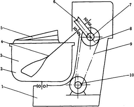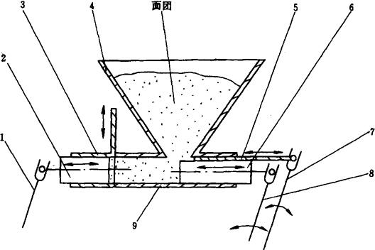 图1-9-20 强力和面机 1-机架 2-电动机 3-和面缸 4-扭环形搅拌桨 5-安全防护罩 6-传动蜗轮 7-传动蜗杆 8-大皮带轮 9-三角传动带 10-小皮带轮 工作过程:电动机通过三角皮带和蜗轮蜗杆传动,带动倾斜安置的旋转主轴和搅拌桨转动,这种搅拌桨经特殊设计制成扭环状,能够促进面团面筋的形成。在面团的翻滚、摩擦作用下,和面缸也绕转动中心转动。这样,在桨叶与和面缸的同时转动下,面团得到充分的混合、摔打,对于面筋的形成极为有利。这种机型还有一个特点就是和面缸可以很方便地从机架上推卸下来。多配几只和面缸就可兼作发酵用的发酵槽,面团调制好后,不需更换容器就可推入发酵室内发酵,提高了工作效率。 这种和面机采用双速电动机,可使搅拌桨做高速或低速旋转,以满足不同的面包面团的调制工艺对和面机转速的要求。 3.2 面团切块机 应用最广的是真空吸入式面团切块机(图1-9-21),这种切块机主要由机架、料斗、切块机构、传动机构等组成。