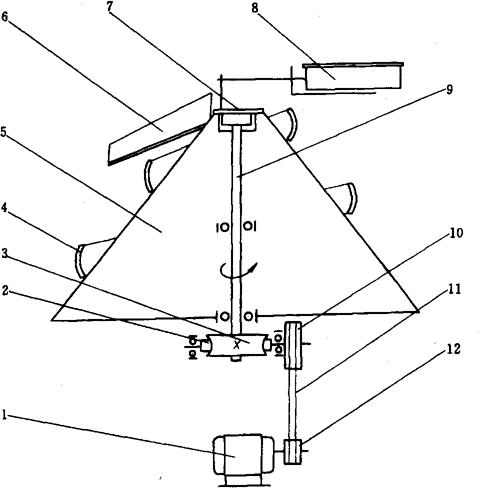 图1-9-22 伞形揉圆机 1-电动机 2-蜗杆 3-蜗轮 4-螺旋导槽 5-伞形旋转体 6-面团输出导板 7-撒粉驱动偏心轮 8-撒粉器 9-旋转主轴 10-大皮带轮 11-三角皮带 12-小皮带轮 工作过程:电动机带动三角带轮、蜗轮、蜗杆转动,从而驱动旋转主轴9和与主轴固连的伞形旋转体5转动。螺旋导槽4通过支撑与机架固连,不随伞形旋转体转动。 来自切块机的面块由伞形旋转体的底部进入螺旋导板,由于旋转体的旋转及固定螺旋导板的圆弧形状,使导板与面块、面块与伞形旋转体表面产生摩擦力,以及面块在旋转体旋转时所受离心力的作用,使面块沿螺旋导槽由下向上运动。在此期间,面块即有公转又有自转,即有滚动又有微量的滑动,从而把面块揉成圆形。揉圆完毕的球形面团从伞形转体的顶部离开机体,由输送带送出。 在揉圆机上还装有撒粉装置,通过转体顶部的撒粉驱动偏心轮7拉动拉杆,使撒粉器8的轴心作径向摆动。将撒粉器内的面粉均匀地撒在螺旋导槽内,防止操作时面团与转体、导槽及面团之间粘连。 由于伞形转体上下直径不同,使得面块从底部进入导槽由下向上的运动速度减慢,这种进口速度快,出口速度慢的特点,有利于面团的成形。 3.3.2 碗形揉圆机(图1-9-23) 碗形揉圆机的结构与伞形揉圆机大致相同,只是转体倒置,大端在上,小端在下,呈碗形。固定螺旋导板安装在转体内侧,导板与转体组成面块成型的导槽。