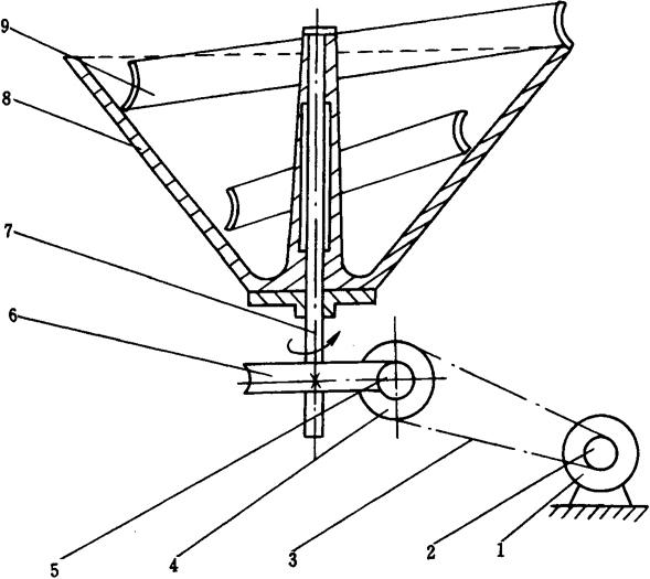 图1-9-21 面团切块机工作示意图 1-卸料活塞驱动摆杆 2-卸料活塞 3-小缸体 4-料斗 5-切刀 6-推料活塞 7-切刀驱动摆杆 8-推料活塞驱动摆杆 9-大缸体 面团切块机的切块工作由面团的吸入,充填、排出三个动作来完成。 首先,切刀驱动摆杆带动切刀向右移动,使得料斗4与大缸体9的通路被打开。这时,推料活塞6也由活塞驱动摆杆8带动向右移动,使得大缸体内形成瞬时真空,面团在大气压力和重力作用下,进入大缸体内,完成吸入动作。 接着,切刀向左移动,将料斗与大缸体的通路关闭,并将面块与面料斗中的面团切割分离。随后推料活塞向左移动,同时卸料活塞2也向左移动。这样,大缸体内的面块就被推入小缸体内,完成充填动作。 然后,小缸体连同卸料活塞同时下移,以使小缸体3内的面块与大缸体内的剩余面块分离,同时小缸体右侧的端口被打开。在卸料活塞驱动摆杆的作用下,卸料活塞向右移动,将面块推出小缸体。而后小缸体又向上移动复位,同时面块被大缸体下面的刮刀从卸料活塞端面上刮掉,落入面块输出带上被送出,完成排出动作。至此面包切块的一个工作循环结束,下一个工作循环接着进行。 面团切块的重量,可以通过卸料活塞的移动行程的调节而进行控制。 这种真空吸入式面团切块机的特点是操作简便,传动平稳,定量也比较准确。 3.3 面团揉圆机 目前国内生产和使用的揉圆机,主要有伞形揉圆机和碗形揉圆机两种。这两种揉圆机的螺旋曲线基本相同。但旋转定位方向不同,面团运行速度与离心力的作用也不同,一般说来,碗形揉圆机适用于小面团的揉圆,伞形揉圆机适应于大面团的柔圆,能够方便地配合机械化生产。 3.3.1 伞形揉圆机(图1-9-22)伞形揉圆机是目前在国内应用最广泛的揉圆机。
