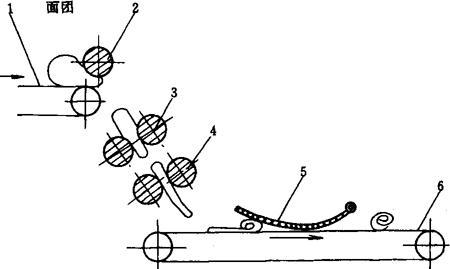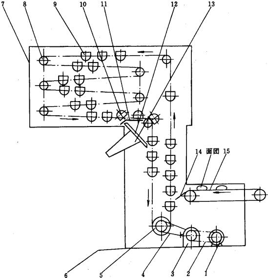 图1-9-24 面包成型机成型原理图 1-送入传送带 2-压扁辊 3-第一压延辊 4-第二压延辊 5-卷包垂链 6-送出传送带 面包成型机主要用来完成对面团的辊轧、卷制和成型的工艺操作。工作时,经面团送入传送带1送进的面团先被压扁辊2进行辊压,然后被送入第一和第二压延辊,经辊轧制成面片,辊制成的面片落入面卷送出传送带6,继续向前输送,到达卷包垂链5处,在垂链的压力作用下,面片向里卷曲。经送出传送带与面卷,以及面卷与卷包垂链间摩擦力的作用,面片越卷越紧,直至被卷成面包卷,经送出传送带送出。根据需要在送出传送带前,还可装置各种滚形槽,经整形制成面包生坯。 经成型后的面包生坯即可装听或入烤盘送去进行最后醒发。 3.5 醒发设备 常用的醒发设备分为中间醒发设备和最后醒发设备两种。国外大批量生产面包的厂家,为配合机械化连续式生产的需要,不仅中间醒发采用了机械式,而且最后醒发也采用了多层回转自动醒发机,国内有一部分中间醒发采用了机械式醒发机外,大部分都还在使用醒发房和醒发箱来进行中间、最后醒发工艺的操作。 3.5.1 中间醒发机 常用的中间醒发机(图1-9-25)主要由面团进料机构、出料机构、面团网斗、传动机构和箱体等组成。