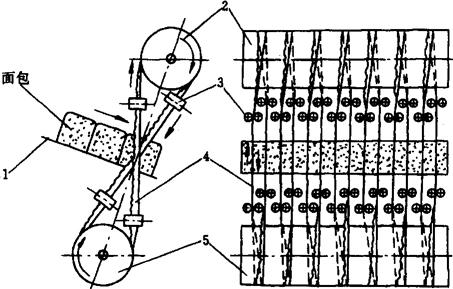 图1-9-26 面包切片机工作示意图 1-送料斗 2、5-刀片驱动辊 3-导轮 4-刀片 在上下两个刀片驱动辊上,均匀间隔地交叉围绕着若干带式刀片。每个刀片被两对导轮夹持着,将刀片扭转90°,使所有刀刃口朝进口方向,一圈环形刀片成为两条刀刃,在辊子的带动下,作快速直线运动。运动的方向,一条刀刃向上,另一条刀刃向下,故在切片时给予面包的摩擦力上下相互抵销,不影响面包在切片时的稳步行进。当面包由进料斗横向进入后,即可一次切成若干片。切片厚度可以通过左右移动导轮的相互位置来调节,调节范围在10~24mm之间。 |