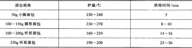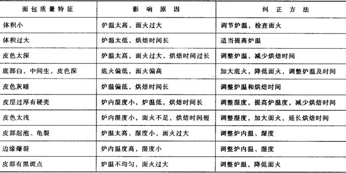 (四)烤炉的选择 烘焙是面包质量的决定性操作,因此,烤炉的选择至关重要。一般应选择能控制面、底火并有加湿装置的烤炉,以确保生产出高质量的面包。烤炉的种类很多(详见设备篇),应根据班产量来选择。产量很大时,应选择隧道式电烤炉,以保证生产的正常进行和面包质量的稳定;产量不大时(每天生产半吨以下面粉),应选择电烤箱,既能保证面包的正常烘焙,又利于节能。应尽量选择远红外加热烤炉。 远红外线烤炉具有加热速度快、生产效率高、烘焙时间短、节电省能、烘焙均匀、面包质量稳定等特点。 (五)面包内部组织的质量要求及影响因素 面包组织是面包感官质量评分的最重要指标之一。总的质量要求是:组织均匀、色泽洁白、无大孔洞、富有弹性、柔软细腻、气孔壁薄。面包组织除受烘焙条件的制约外,还与入炉前的各道工序操作有直接关系。 (1)发酵不足的面团,面包组织壁厚、坚实而粗糙,气孔不规则或有大孔洞。发酵过度的面团,面包组织壁薄,过软,易破裂,多呈圆形。 (2)饧发不足的面团,面包体积小,组织紧密。饧发过度的面团,入炉后引起气孔薄膜破裂,致使面包塌陷或表面凹凸不平、组织不均匀。 (3)面团搅拌过度与发酵不足的现象相同。 (4)经过轧片、卷起的面团,烘焙后的面包组织非常均匀,无任何大孔洞,气孔小,很像小海绵状,并成丝状和片状,可用手一片一片地撕下来。 (5)烘焙温度直接影响面包的组织。如果入炉后上大火,面包坯很快形成硬壳,限制了面团的膨胀,造成面包坯内气压过大,使气孔膜破裂,形成粗糙、壁厚、不规则的面包组织。因此,适当的炉温和烘焙方法对获得均匀的面包组织是非常重要的。一般情况下,适当延长烘焙时间,对于提高面包质量有一定作用,它可以使面包中的水解酶作用时间延长,提高糊精、还原糖和水溶性成分的含量,有利于面包色、香、味的形成和消化吸收。 表2-2-10为烘焙条件对面包品质影响及其纠正方法。 表2-2-10 烘焙条件对面包品质影响及其纠正方法