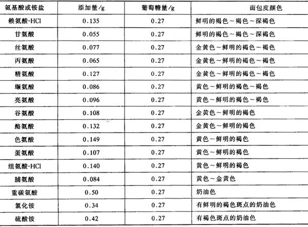 3.烤炉内的湿度控制 炉内湿度对于面包质量有着重要影响。如果炉内湿度过低,会使面包皮过早形成并增厚,产生硬壳,表皮干燥无光泽,限制了面包体积的膨胀,增大面包的质量损失。如果湿度适当,可加速炉内蒸汽对流和热交换速度,促进面包的加热和成熟,减少面包的质量损失,增大面包的体积,此外,还可以传给面包表面淀粉糊化需要的水分,使面包皮产生光泽。 现代化的面包烤炉,都附有恒湿控制装置,自动喷射热蒸汽或水雾来提高炉内湿度。由于大型面包生产线产量大,面包坯一次入炉内,面包坯所蒸发出来的水蒸气即可自行调节炉内湿度。但对于小型的烤箱来说,湿度往往不够,需要在炉内放一盆水以增加湿度。焙烤面包时,不应经常打开炉门。一般烤箱上方设有排烟、排气孔,焙烤时应将该孔关上,防止水蒸气从炉内散失。 (二)面包表皮在烘焙中的褐变 面包在烘焙中产生金黄色或棕黄色的表面颜色,主要由以下两种途径来实现: 1.美拉德反应 面包坯中的还原糖,如葡萄糖和果糖,与氨基酸之间产生羰氨反应,产生有色物质。这个过程称为美拉德反应。 2.焦糖化反应 糖在高温下发生的变色作用称为焦糖化反应。参加焦糖化反应的糖包括酵母发酵剩余的蔗糖、麦芽糖、果糖、葡萄糖等。 此外,鸡蛋、乳粉、饴糖、果葡糖浆等均有良好的着色作用。 在美拉德反应中,不同种类的糖发生褐变的程度不同。一般认为属于非还原性的糖,不起褐变反应。通过酵母分泌的转化酶的作用,在面团发酵过程中,蔗糖可部分降解为葡萄糖和果糖而具有着色作用。 蛋白质、氨基酸和铵盐引起褐变反应的程度随种类的不同而有差异。面包中常常加入作为营养强化剂的赖氨酸。赖氨酸也是褐变反应相当强烈的一种氨基酸。但经过烘焙,面包皮中的赖氨酸大部分损失掉。此外组氨酸、色氨酸、酪氨酸等褐变反应也非常强烈,而脯氨酸、谷氨酸等则比较弱。 蛋白质也能引起面包表皮的褐变反应。不同蛋白质引起的褐变颜色不同:小麦蛋白质引起的褐变颜色;鸡蛋蛋白质引起的褐变呈红褐色;加入少量转化糖或葡萄糖,会使面包表皮呈红褐色鲜艳而美观。 铵盐与糖类也能引起面包表皮的褐变。但铵盐与糖反应时会生成一些有毒的物质,故在面包生产中应控制其使用量。 生产面包时添加不同的葡萄糖与氨基酸或铵盐,可使面包表面产生不同的颜色。表2-2-8为糖与铵盐或氨基酸对面包皮颜色的影响。 表2-2-8 糖与铵盐或氨基酸对面包皮颜色的影响(面团重量为25g)