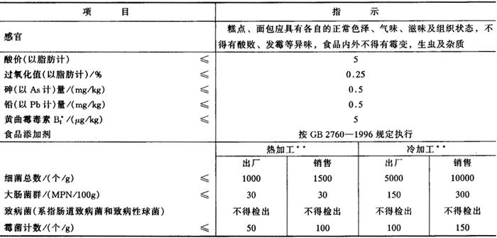 注:*非强制性执行标准。 * *热加工糕点(面包):加工过程中以加热制作为最终工艺的糕点(面包)类食品。 冷加工糕点(面包):加工过程中在加热熟制后再添加奶油、人造黄油、蛋白、可可等辅料而不再经过加热的糕点(面包)类食品。 |