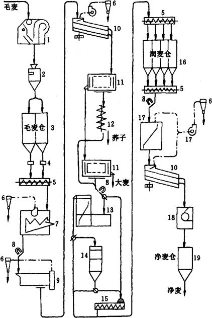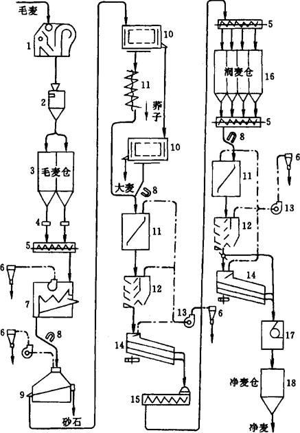 图1-2-15 湿法清理流程图 1-初清筛 2-自动秤 3-毛麦仓 4-配麦器 5-螺旋输送器 6-离心集尘器 7-振动筛 8-磁钢 9-擦麦机 10-平面回转筛 11-碟片精选机 12-抛车 13-去石洗麦机 14-水分调节器 15-水杯着水机 16-润麦仓 17-立式打麦机 18-永磁滚筒 19-净麦仓 (1)初步清理工序 清除小麦中大、中型杂质(麦秆、麦穗、破布、麻绳等)和轻杂质(草屑、泥灰等),以提高后道清理设备的除杂效果,减少车间污染。采用鼠笼式初清筛清除大杂质,如受条件限制,可用振动筛(带通风机)代替,但应将分离大杂质的筛孔适当放大些,以增加处理量。毛麦仓前装自动秤以记录进入车间的毛麦数量。有条件的工厂可在净麦仓后再安装自动秤,以记录净麦数量。 小麦搭配在毛麦仓下进行,通过配麦器控制搭配比例,在麦仓下的螺旋输送机中混合。 设有立筒库的制粉厂,初步清理在工作塔中进行,在立筒库下进行小麦搭配,然后直接进入毛麦仓。 (2)毛麦清理 集中清理小麦中尘荞杂质,使其降低到入磨净麦要求。采用两道筛选、一道打麦、两道磁选及精选、洗麦的清理过程。两道磁选分别在打麦机和洗麦机前,以保证金属杂质不落入机内。打麦采用擦麦机轻打,精选采用碟片精选机,先精选荞子,后精选大麦燕麦。分离出来的荞子再经过抛车检查。为减少精选机数量,亦可先将小麦进行大小粒分级,再从大粒麦中精选大麦和燕麦,从小粒麦中精选荞子。 (3)水分调节工序 小麦在制粉前利用水、热、时间三种因素的作用,改善小麦的工艺性质,称为小麦的水分调节。水分调节分为室温水分调节和加温水分调节两种。在室温条件下,将小麦着水后,再在仓内存放一定时间的水分调节方法称为室温水分调节;将小麦着水后,用水分调节器处理,再在仓内存放一定时间的水分调节方法称为加温水分调节。小麦水分调节的目的是调整小麦水分,借以改变麦粒的物理、化学性质,使其适应制粉的工艺要求,获得良好的工艺效果,同时减少润麦时间,而且对高水分小麦也能处理。对于高水分、含砂量大的小麦,可经洗麦机和水分调节器处理,对低水分、含砂小麦经洗麦机和水分调节器后,再进入水杯着水机进行二次着水。如果为加温水分调节,小麦“热”因素可加速水分调节过程的完成。但小麦在水分调节器内要经过预热、加热干燥和冷却三个阶段。 (4)光麦清理工序 毛麦清理后仍未达到理想的干净程度,另外小麦经水搅拌摩擦,有部分表皮被撕开混入麦中,这些杂质对面粉质量有影响。采用一道打麦、一道筛选,两道磁选的过程,经水分调节后的小麦,用立式花铁筛打麦机进行“重打”,以加强打麦效果。最后一道磁选,采用永磁滚筒,以保证入磨净麦中不含磁性金属杂质。 磨制等级粉时,最好在净麦仓前增加喷雾着水机,并利用净麦仓进行30min的润麦。 该湿法清理流程,可根据各地小麦含杂具体情况加以调整。如我国北方小麦砂石多,含荞子、小麦、燕麦少,在磨标准粉时可以不设精选机,而在头道麦筛后增加一道相对密度去石机,而在小麦水分偏低的地方,小麦清理流程可不采用水分调节器。 2.1.2 干法清理流程(图1-2-16)