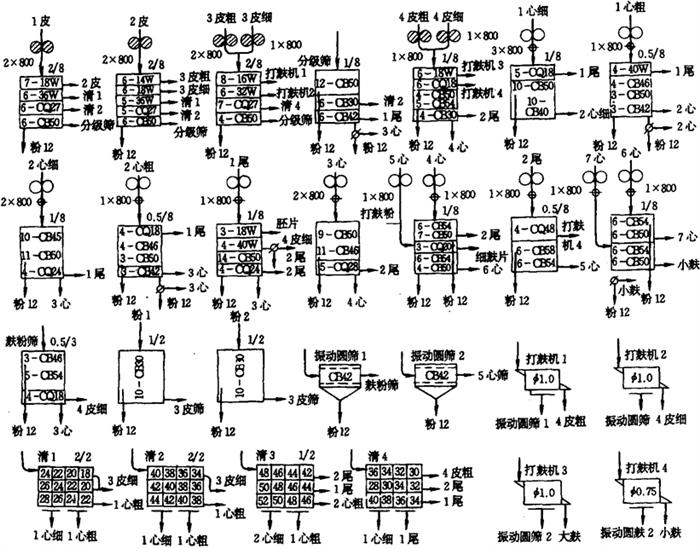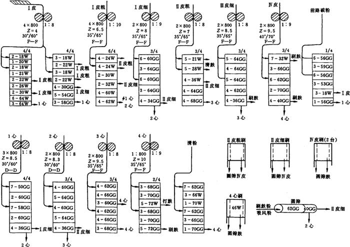 图1-2-16 干法清理流程图 1-初清筛 2-自动秤 3-毛麦仓 4-配麦器 5-螺旋输送器 6-离心集尘器 7-振动筛 8-磁钢 9-吸式比重去石机 10-碟片精选机 11-抛车 12-吸式风选器 13-风机 14-平面回转筛 15-水杯着水机 16-润麦仓 17-永磁滚筒 18-净麦仓 (1)毛麦清理 采用筛选、去石、精选、打麦的工艺组合,目的是提高精选、去石效果,并减少打麦机的磨损。去石机采用吸式相对密度去石机,以改善操作条件。打麦机采用立式花铁筛打麦机,通过调节其转速及间隙,进行“轻打”。打后用吸式风选器分离出打下的轻杂质。 (2)水分调节 采用水杯着水机,不需动力,小麦在一般含水量下,能满足着水需要。但对低水分的硬质麦,宜使用自控强力着水机,以加大着水量。 (3)光麦清理 采用立式花铁筛对小麦“重打”,打后小麦经吸风分离出打下的麦毛、麦皮等轻杂质,然后进入平面回转筛进一步分离出小杂,再经磁选进入净麦仓。 上述方法适合南方地区。南方地区所产小麦软质较多,水分较高,含砂少,含荞子多,气侯温和。因此,在加强打麦、去石、吸风的基础上,可以不用湿法清理,也不需加温水调节器。 2.2 粉路 粉路亦即制粉流程。它是把经过清理及水分调节而适合加工的净麦,按一定的产品等级标准进行加工的生产工艺流程。它是磨粉、筛理、清粉、刷麸等工序的组合。制粉的装备与要求加工的面粉精度有关。 我国目前制粉方法大体可分为三种:前路出粉法(标准粉的工艺特征)、前路均衡出粉法(特二粉的工艺特征)、中路出粉法(特一粉的工艺特征)。 2.2.1 标准粉粉路在制粉中,把前后系统的好粉和次粉混合在一起,不分等级地组成一种面粉,在我国称为标准粉。其出粉率在85%左右,由于其颗粒较粗,允许少量麸屑混在面粉中,灰分较高。标准粉目前广泛采用前路出粉法,即在制粉流程的前路研磨系统(Ⅰ皮,Ⅱ皮,1心,1渣)大量出粉的制粉方法。采取的措施是:加大前路研磨压力,提前出粉;加宽前路,缩短研磨道数,合理简化粉路;光辊拉丝,适当放粗筛绢。图1-2-17所示为标准粉粉路图。