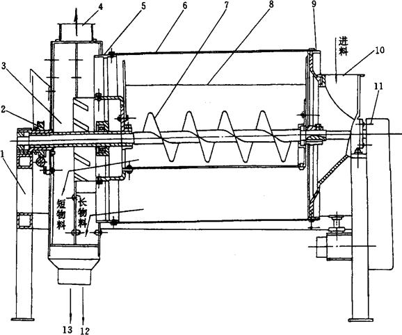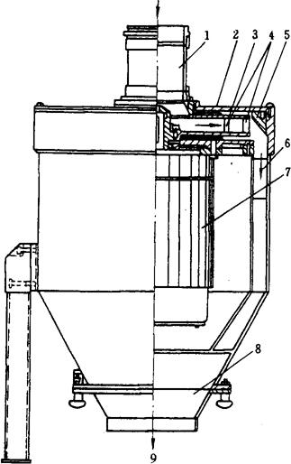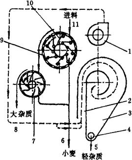 图1-2-22 去石洗麦甩干机工作原理图 1-小麦入口 2-喷砂管 3-集石斗 4-石子绞龙 5-小麦绞龙 6-甩板叶轮 7-机座 8-筛板圆筒 9-出麦口 10-上帽 11-洗槽 (6)精选设备 ①碟片精选机 碟片精选机具有体积小、产量大等优点,其结构示意图如图1-2-23所示。