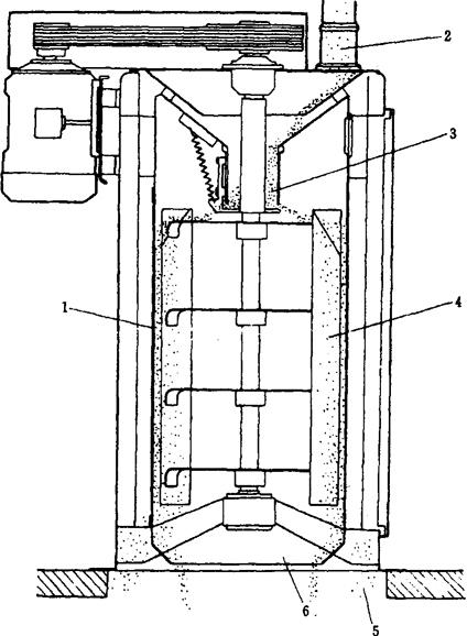 图1-2-40 立式振动圆筛 1-打板 2-打板托 3-电机 4-筛筒 5-主轴 6-集料斗 打板转子的主轴5上端与电机3直连,其上装有3只打板托2,轮上固定金属打板1两块或三块。打板上装有倾斜的叶片(图1-2-41)。上、中、下叶片的倾斜角度可取不同值,一般上、下部位的角度略小,以利于进机物料上移、出机物料推送。