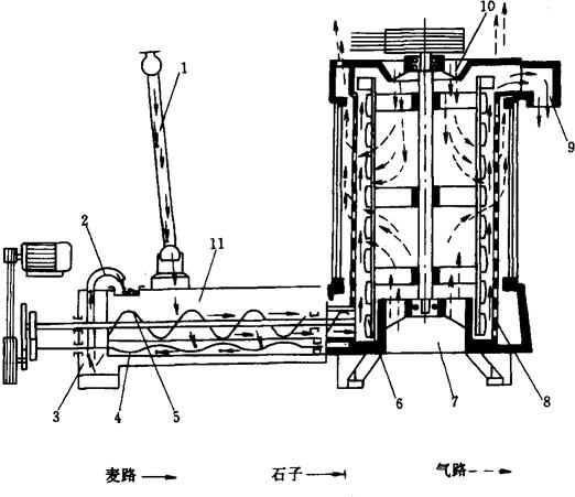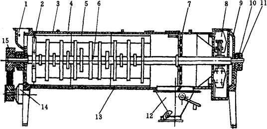 图1-2-21 擦麦机结构图 1-进料口 2-打板 3-上盖 4-齿板 5-光板 6-主轴 7-筛网板 8-风机 9-墙板 10-轴承 11-轴承座 12-出料口 13-底槽 14-电动机 15-三角皮带轮 (4)去石设备 参见本章第1节。 (5)洗麦设备 洗麦设备分为去石洗麦机和立式洗麦机等。前者起洗涤、着水和分离砂石作用;后者起洗涤和温和的打击作用。图1-2-22所示为去石洗麦甩干机的工作原理图。工作时,小麦从小麦入口1进入洗槽11。洗槽内装有2对绞龙,上面的一对为小麦绞龙5,为便于石子穿过,采用橹桨式叶片。当小麦进入洗槽中翻动着的水中,因不能及时下沉而呈悬浮状态即被送往甩干部分。下面的一对为石子绞龙4,采用满面式叶片,用来将石子送往相反方向。待砂石落入洗槽尾部的集石斗3后,由喷砂管2喷入滤砂盒内,由喷砂管2定时清理出机外。麦粒由小麦绞龙5送到甩干部分的底部后,由于甩板叶轮6的旋转作用,在离心力的作用下将麦粒抛向筛板圆筒8的内壁,将附着在麦粒表面的水和细小杂质从鱼鳞孔甩出。同时将麦粒从底部成螺旋形向上推送到甩干部分顶部,由刮板把麦粒从上帽的出麦口9排出。在甩板叶轮转动时,气流从上帽10、机座7的进风口引入而从筛板圆筒表面的鱼鳞孔排出,使麦粒进一步脱水,并使筛孔得到清理。被分离出来的污水,可直接从机器放出,也可重新回到洗槽的回水箱,经沉淀后使用。
