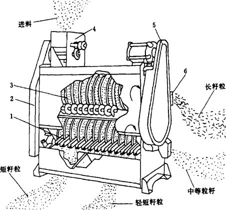 图1-2-23 碟片精选机结构示意图 1-短粒出口 2-机架 3-碟片 4-进料斗 5-传动装置 6-长粒出口 其主要工作构件是一组同轴安装的圆环形铸铁碟片3,碟片的两侧工作面制成许多特殊形状的袋孔,碟片在经进料口流入的小麦中转动时,短粒物料会被嵌入袋孔而被带入较高位置。由于孔底逐渐向下倾斜,短粒物料受本身的重力作用再从袋孔中倒出,落入收集槽中;长粒物料则因长度较袋孔长,仍有可能装入袋孔,且因其重心仍在袋孔之中,故当碟片到一定的高度,即从袋孔中滑落下来。根据此原理就能达到长粒物料与短粒物料分离的目的。 ②滚筒精选机 滚筒精选机是另一种利用袋孔分离杂质的设备。其主要工作构件为一内表面制成袋孔的旋转滚筒。如图1-2-24和图1-2-25所示。当物料进入滚筒后,长粒物料在进料的压力和滚筒本身倾斜度的作用下,沿滚筒长度方向由机器另一端流出;短粒物料则嵌入袋孔被带到较高的位置,落入盛物槽沟中,由此而得到分离。