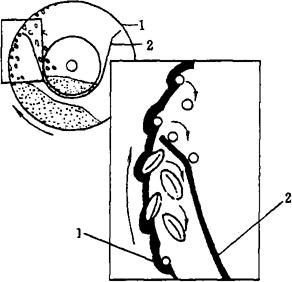 图1-2-24 滚筒精选机工作原理图 1-带袋孔的滚筒 2-盛物槽