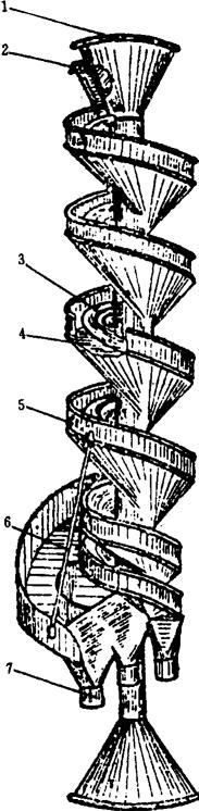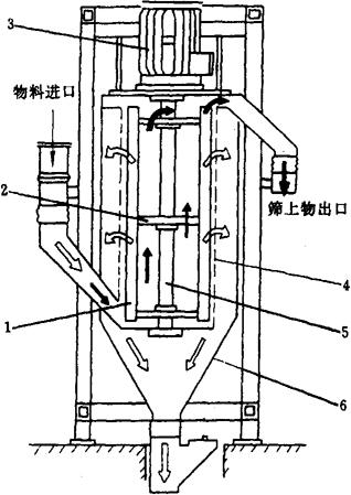图1-2-39 高方平筛1号筛路 (2)振动圆筛 圆筛可分为无打板圆筛,打板圆筛和振动圆筛三种,以振动圆筛性能最优。与前者相比振动圆筛具有结构紧凑、体积小、产量高,维修方便、筛面清理效果好等优点。它是制粉厂较理想的一种筛理机械,一般用于筛理刷麸粉或吸风粉,设在后路或刷麸机的后面,作为辅助筛理设备。 振动圆筛分立式和卧式两种,主要工作部件即是作高速微振的筛筒和筛筒内部的打板转子,与打麸机类似。其中立式振动圆筛筛筒直立式配置可减轻粉筛筛网的负荷,延长使用寿命。其基本结构如图1-2-40所示。
