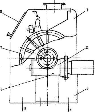 图1-2-36 撞击松粉机 1-进料筒 2-上盖 3-甩盘 4-销柱 5-撞击圈 6-环形料槽 7-电动机 8-集料斗 9-出料口 (2)打板松粉机(图1-2-37) 打板松粉机的基本结构为一横置的工作圆筒6,内衬钢板,筒体内4个打板2通过支架3与主轴4相连。工作时,打板随主轴高速旋转。物料从工作圆筒一端的进料口1进入机内后,即受打板的打击与推进,粉片被打碎,松散的物料即从圆筒另一端的出料口5排出。