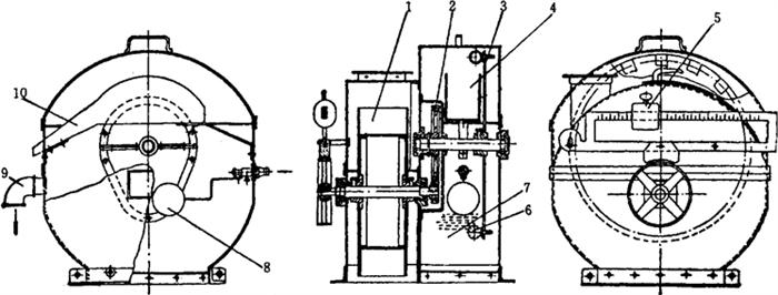 图1-2-27 永磁滚筒 1-上机体 2-蜗轮减速器 3-下机体 4-磁性金属杂质出口 5-小麦出口 6-泄油孔 7-磁铁滚筒 8-观察窗 (8)小麦水分调节设备 ①水杯着水机(图1-2-28) 该机在工作时,叶轮1借助小麦的下落冲击力旋转,通过齿轮2带动着水轮3,着水轮由一圆盘和上面装置的16个水杯6组成,在水箱7中转动,水杯待水舀起后倒入1个呈半圆形的接水槽4中,然后再流入斜槽10。斜槽中的水通过一细管流进着水绞龙中,与小麦混合,秤锤5用来控制调整叶轮的转速。