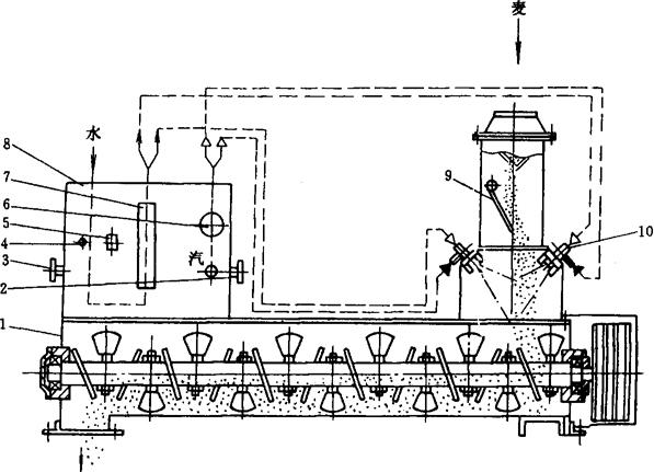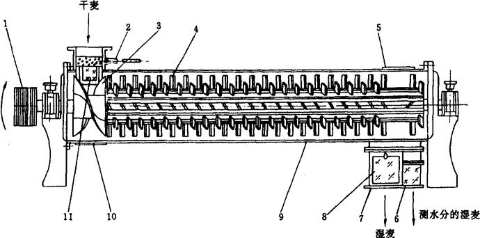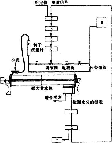 图1-2-29 强力着水机 1-传动轮 2-进水管 3-螺旋推进器 4-打板 5-活门 6-水分检测管 7-出料口 8、11-观察窗 9-筒体 10-卸料门 在进料口下的主轴上,装有双头螺旋推进器3,加速对物料的起动,以减轻打板叶轮的搅拌阻力。进料和出料形式都采用与打板叶轮方向一致的切线进料和切线出料,以利于物料起动和排净。进水方式是采用在进料口处水管滴水。 工作过程:小麦进入机器与从进水管来的水接触后,落入螺旋推进器3进行混合,并被加速推送到打板工作圆筒。在打板4的高速旋转作用下,小麦沿筒体内壁的整个圆周作旋转运动,形成一个“麦流”。打板叶轮对麦流作相对运动,使麦流中每个麦粒受到打击,并引起相互摩擦,麦粒的表层被软化和部分撕碎。水滴在强离心力的作用下均匀撒到麦粒表面,并以较快速度均匀渗透到麦粒各部分。 着水后的小麦,一部分经水分检测管6检测水分后,与大部分从出料口7流出的小麦混合一起,进入润麦仓。 b.加水自动控制系统加水自控制系统是根据生产过程每一瞬间原粮水分和流量的变化自动调整着水量,使着水后小麦的水分稳定在制粉工艺所要求的范围内,以保证着水过程的稳定性。 加水自控系统由VS-1型微波测水仪和DDZ-Ⅱ型电动单元组合仪表构成,它以着水后的湿麦为监控对象,给以一定值。当湿麦水分发生变化时,信号反馈到执行器的输入端,成为执行器调节作用的依据,使着水后小麦水分保持不变,该系统组成如图1-2-30所示。