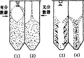 图1-2-31 喷雾着水机 1-搅拌输送机 2-气压调节阀 3-水流量控制阀 4-水、汽开关 5-水、汽指示灯 6-气压表 7-水流量计 8-水、汽控制装置 9-料流检测挡板 10-雾化喷头 工作过程:定量水和高压气体同时进入雾化喷头,水以雾状喷向小麦,再由搅拌输送机使水在小麦中的分布更加均匀。输送机采用桨叶式叶片,以加强对物料的搅拌作用。叶片的外缘与机壳的间隙不超过2.5mm。喂料处设有料流检测挡板9,以测定有无来料。有料,则挡板在麦流冲力的推动下绕挡板轴转动,挡板轴端的压杆启动水气电磁阀的微动开关向喷头供水和供汽;无料,则水、汽停止供给。 喷雾着水机的主轴转速为105r/min,空气压力为200~400kPa,2个喷头,喷孔直径为0.21mm,雾滴粒径<100μm,雾化扇形宽度为180~200mm,功耗0.15kW/t(麦)。在其他类型的喷雾着水机中,在麦粒进料口处装有上、下两个可以高速旋转的圆盘,当麦粒落入上面圆盘时,圆盘以20m/s的线速度旋转,麦粒由于离心力作用而向圆盘四周甩出。而水流入下面另一圆盘,同样在离心力作用下扩散成雾状,并与上面圆盘落下的麦粒相遇,使麦粒润湿。湿润后的麦粒落入绞龙中拌和,其工作过程同上。 喷雾着水机着水均匀,着水量一般只在0.3%左右,最大不超过1.5%,故适合于入磨前的水分含量要求。 ④润麦仓 润麦仓的作用在于小麦着水后,使水在小麦内部有一定渗透时间,以达到调节水分的目的。 润麦仓一般采用钢筋混筋土结构。截面呈方形或矩形,边长为1.5~2m,内壁表面要求光滑,四角做成宽为150~200mm的斜棱,以减少麦粒膨胀结块的机会,仓底部分做成漏斗形,尖底与水平的夹角为60°,便于湿麦流动。 小麦在麦仓中放出时,由于麦粒间的摩擦力小于麦粒与仓壁间的摩擦力,使得麦仓中心的小麦先行流出,而麦仓四角的小麦最后流出。这样,在中心部位的小麦流出后,上部接近仓壁的小麦不断向中心部位补充,由此造成了后入仓的小麦反而先流出的现象,使润麦时间不足,如图1-2-32所示(3)、(4)。 另外,小麦在入仓后,由于麦粒饱满程度不同和接受风力不同,出现自动分级现象。重的麦粒直落在麦仓中心部位,轻的麦粒则散落在麦仓的四周。因此,麦仓开始放出的是重而质好的小麦,后放出的是轻而质差的小麦,这就影响了制粉生产的均衡性。为解决上述这些问题,一般采用以下几种方法: a.麦仓多设出口,以克服小麦出仓时中心部位先流出的现象。 b.在麦仓入口处装分散器,即在仓顶中心的入口处吊一铁皮制的圆锥如图1-2-32(1)。小麦流入时,撞在锥顶上向四面弹起,使重的、质好的小麦不致直落到麦仓的中心;轻的、质差的小麦不致全部落到仓壁处,以打破自动分级现象。改变分散器的锥度,可调节轻、重麦粒的分布。