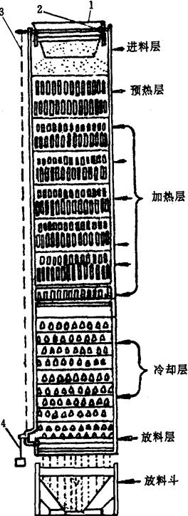 图1-2-32 麦仓中小麦的流动 c.如未采取上述措施,则可使2个麦仓同时以不同的部位流出小麦,相互搭配,避免前后流出小麦的质量变化。 ⑤水分调节器 水分调节器的作用主要是利用“热”的因素加速小麦水分调节过程的完成,以获得良好的制粉工艺效果。对高水分小麦可进行烘干。 工作过程:使用热水加热金属表面,把热传给小麦,促进水在麦粒中的传布,并利用空气来带走小麦蒸发出来的水汽。小麦在水分调节器内,要经过预热、加热干燥及冷却等几个阶段。 一般的水分调节器大都是热水式,仅个别是热空气热水式,它们都经过上述三个阶段。热水式水分调节器的结构如图1-2-33所示。