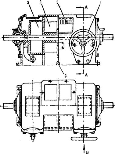图1-2-34 配麦器 1-翼片 2-隔板 3-圆筒形盖 4-手轮 5-刻度表 小麦通过配麦器的流量,可以用改变叶轮的转速或空格的宽度来控制。改变宽度是用1个可移动的圆筒形盖3来进行的。圆筒形盖3的内壁与叶片靠的很近,它通过手轮4转动一对蜗杆与扇形蜗轮,将圆筒形盖3左右移动,以调节空格的宽度。配麦器中流过小麦的多少,可从两叶轮外壳的刻度表5表示出来。 配麦器可由1个麦仓进料,也可同时由2个麦仓进入配麦器的两个部分。 3.2 粉路用关键设备 小麦制粉使用的关键设备有磨粉机、平筛、清粉机、打麸机、刷麸机、圆筛和松粉机等。 3.2.1 辊式磨粉机 辊式磨粉机是磨粉的理想设备。该类磨粉机按磨辊数量可分为单式和复式磨粉机。复式磨粉机装有两对磨辊,可以用来研磨不同的物料。按照成对磨辊的排列方式来分,则可分为磨辊倾斜排列和磨辊水平排列。如果按照来料或断料时合闸或松闸的自动化程度来分,则可分为人工操作和由液压或气压控制的自动磨粉机。本文将以磨辊倾斜排列、油压自动控制的复式磨粉机为例介绍辊式磨粉机的工作原理(图1-2-35)。