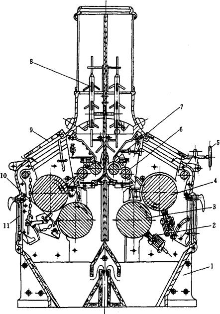 图1-2-35 辊式磨粉机 1-机座 2-清理刷 3-慢辊 4-快辊 5-轧距调节手轮 6-喂料辊 7-喂料活门 8-存料传感器 9-观察窗 10-刮刀 11-磨膛门 该机顶部设有玻璃进料筒,机壳的上下各有两扇用以观察和操作的活门,机壳内部由隔板将磨粉机分成2个独立的工作部分,每个工作部分分别设有喂料机构、成对磨辊、轧距调节机构、传动机构、松合闸控制机构和清理机构。其工作过程是物料由进料筒进入,经喂料活门7、喂料辊6均匀地进入两磨辊之间,通过磨辊作用将物料磨碎,研磨后的物料从磨膛下部流出。为排除研磨时产生的湿热空气,在磨膛下面中部位置装有吸风道。 该机的喂料机构采用双辊喂料,位于内侧的喂料辊称为定量辊,其作用是承接物料,并将其向两端推送;位于外侧的称为分流辊,其作用是使物料摊成薄层,并准确送入研磨区。喂料辊上方装有喂料活门7,用以控制物料喂入量。根据磨粉机所研磨的物料不同,可以配备不同表面特性喂料辊以适应喂料要求。 该机两磨辊之间的轧距可以根据需要进行调节,以达到规定的研磨效果。轧距调节,既可以调节磨辊两头的轧距,也可以调节磨辊一头的轧距,分别操纵各自的调节机构即可。 该机的松合闸控制由油压机构根据磨粉机顶部物料情况自动执行,其能控制下列操作:磨辊的松合闸、喂料辊的运转或停止、喂料活门的启闭和红绿灯信号指示(绿灯亮表示磨粉机进入工作状态,红灯亮表示来料中止)。 该机的清理机构的作用是除去粘附在磨辊表面上的粉块,保证磨辊的正常工作。 3.2.2 松粉机 生产等级粉时,心磨系统一般采用光辊,所以麦心经研磨后容易形成粉片,故在心磨系统的平筛前面需加设松粉机,用来处理心磨系统的磨下物,松散粉片提高筛理效率,增加心磨的取粉率、为缩短心磨系统道数创造条件。 松粉机有撞击式松粉机和打板松粉机。 (1)撞击松粉机(图1-2-36) 撞击式松粉机的基本结构是一个大的圆柱筒体,下部连接集料斗。筒体由3个撑脚支撑,电动机安装在筒体内。工作时,电动机7轴直接传动甩盘3作高速旋转。从心磨出来带有粉片的物料从进料筒1喂入,落到甩盘上,受离心力作用被甩到周边的撞击圈5(铸铁制)上进行碰撞,使粉块松散。物料被减速后沿四周的环形料槽下落,经集料斗8从中央出口排出机体。部分弹回的物料则被销柱4拦截。