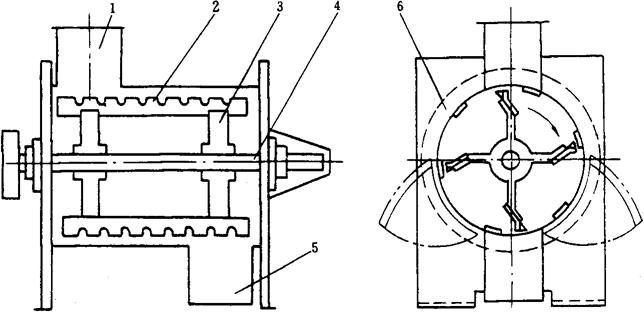 图1-2-33 热水式水分调节器 1-进料斗 2-杠杆 3-钢丝绳 4-放料机构 小麦自进料斗1流入,此进料斗通过杠杆2、钢丝绳3与放料机构4相连,使小麦放出量与入机流量相配合。 最上面一层安有铸铁散热管(热水管)的部分即为预热段,上、下两排散热器的排列是左右平行,上下交错的。在这一层中,设有通风用的气槽,小麦在这里升温。 自第二层是气槽与散热器相间排列,共有5层,这是加热干燥段。小麦在散热器之间和气槽之间的空隙中缓缓流下。气槽和散热器的形状,以使小麦容易在它的上部流下,而不流存为原则。 经过加热干燥后的小麦,进入冷却段。冷却段由几列气槽组成,气槽也有进气和排气两种,因为通过的空气量大,气槽比在加热干燥段中的要大些。空气流通的途径与加热干燥段相仿,当小麦经过各气槽时,空气穿过麦粒起冷却作用,小麦温度降至20~22℃。 最后,小麦进入放料部分,通过许多排列均匀的孔,由自动控制流量的放料门排出。 (9)小麦的搭配设备 ①小麦搭配的目的 a.保证原料的工艺性质有一定的稳定性。使小麦与麦路、粉路相适应,制粉生产过程和操作方法相对稳定,避免粉路负荷不均、操作频繁及粉路堵塞等情况的产生。 b.保证成品的质量符合国家标准,并保持稳定。例如:特红麦与白麦搭配加工,可保证面粉的色泽。 c.小麦搭配可避免优质小麦单独加工的浪费,也可克服劣质小麦单独加工的弱点,以便更经济、更合理地使用小麦。 ②小麦搭配的方法 a.毛麦仓搭配:有立筒库或毛麦仓的制粉厂,可将不同性质的小麦分仓存放。使用时,同时打开几个麦仓,由仓下放麦闸门或配麦器控制搭配比例,使小麦流入麦仓下的螺旋输送机或其他输送机中配合。 b.润麦仓搭配:分别把各批小麦清理、着水后,进入各个润麦仓,由仓下配麦器或放麦闸门控制配麦比例,在螺旋输送机中混合。也可将分别经过并行的清理流程,进行不同的清理、着水和润麦的小麦,在麦仓出口处进行搭配。 c.进机前搭配:将各批小麦由手推车推到下麦井处,按比例进行混合后入机。这种方法比较简单,但搭配不均匀,费工费时,比较落后。 ③配麦设备 在配麦过程中常使用的设备为配麦器,配麦器的结构如图1-2-34所示。它由2个叶轮组成,每个叶轮带有四瓣翼片1,将空间隔成4个空格。2个叶轮由中间的隔板2隔开,在叶轮外面有外壳包住。当小麦流入配麦器后面的进口时,由于叶片的转动使麦粒落入空格内,然后被带到下部出口流出。