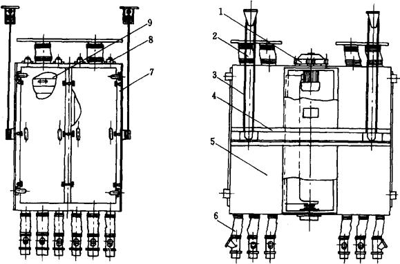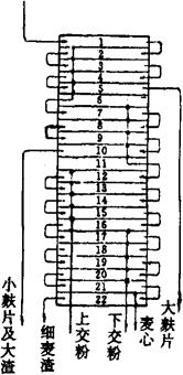 图1-2-38 高方平筛结构示意图 1-传动机构 2-进料装置 3-吊挂机构 4-横梁 5-筛体 6-出料装置 7-钢架 8-压紧机构 9-筛格 高方平筛筛路共分8种,分别适用于前路皮磨、后路皮磨(包括渣磨)、前路心磨、后路心磨及检查筛。合理的平筛筛路应是各级物料分得清,筛理数量大,筛理效率高,而使筛面长度少。图1-2-39所示为1号筛路图,单进口四分级,它适用于前路皮磨。筛格共22层,筛理物料自第1格进入,顺次经5格粗筛筛理,筛上物为大麸片。各层筛下物则穿过通道下流至第6格筛面,到6~10格进行筛理。筛上物为小麸片及粗渣,各层筛下物经由筛下物通道再到11~20格筛理。筛下物为面粉,其中11~15格筛下物为上交粉,16~20格的筛下物为下交粉。其筛上物再经第21~22格分级筛分级,筛上物为细渣,筛下物为麦心。