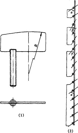 图1-2-41 叶片 (1)叶片 (2)打板上的叶片 工作过程:启动电机,使打板转动,同时轴的一侧装有圆条形偏心块,使筛筒4作高频振动。需要筛理的物料由进料口从筛筒的下方进料,在打板的打击下,将颗粒打散并抛向筛面四周,同时将物料向上推进。筛下物穿过筛孔沿机壳与筛筒间隙经集料斗6从底部出口送出,筛内物则由叶片推向上部的筛上物出口排出。筛筒的高频振动即有利于进行物料的筛理,同时又达到了清理筛面的目的。 (3)刷麸机和打麸机 刷麸机或打麸机是利用旋转的刷帚或打板的作用,把粘附于麸片上的粉粒分离下来,并使其穿过筛孔成为筛出物料,而麸皮则为筛内物,因此它们亦属于筛理机构。一般说它们是处理麸片的最后一道工序,但也可设在前路或中路皮磨系统的平筛之后,处理粗筛上的大麸片,使好粉提前刷外,降低后路皮磨的负荷,有助于提高研磨效率,刷麸机和打麸机的主要工作部件都是带有筛孔的圆筒和圆筒内带有打板或刷子的转子。 ①刷麸机 刷麸机一般采用立式,其结构如图1-2-42所示。