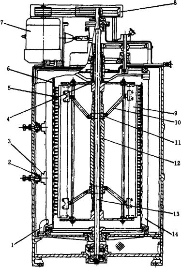 图1-2-28 水杯着水机 1-叶轮 2-齿轮 3-着水轮 4-接水槽 5-秤锤 6-水杯 7-水箱 8-控制水位机构 9-溢水口 10-斜槽 水箱中的水位由浮筒式自动控制水位机构8控制在一定水平上。当水由水管流入水箱时,由于浮球与木阀是用杠杆连接的,当浮球随水箱的水位高低而上下运动时,水阀就自动开大或关小,以保持稳定的水位。水箱上部的溢水口9是防止水阀失灵、水位太高而作排水用的。 水杯着水机是利用麦流的冲力来转动叶轮的,不需要动力,同时能根据麦流的大小,自动调节着水量。麦流大,着水轮转速提高,着水量增加;反之,着水轮转速降低,着水量减少;麦流终止,着水轮停止运转,着水量可达2.5%。着水量的调节可通过改变水杯口的方向来实现,如需着水量多,可把水杯口顺着旋转方向,水杯在转动时就将水舀起;如需着水量少,可把部分水杯调换方向,使杯底顺着转动方向,于是这部分水杯就不起舀水作用。 ②自控强力着水机 该机采用微波自控和强力搅拌等措施进行小麦着水。特点是:着水量大(一次着水量可达4.25%);着水均匀;出机小麦含水量波动范围小(0.1%~-0.2%);对水分较低的小麦可实现一次着水。 自控强力着水机主要包括强力着水机和加水自控系统两大部分。 a.强力着水机 该机结构如图1-2-29所示。在封闭筒体内是一高速旋转的打板叶轮,打板叶轮由固定在打板支架上的打板4、支架、主轴组成。打板断面呈矩形,与主轴中心线的倾角为63°,以四头螺旋线的形式装在打板支架上,主轴每个断面上有4块打板,故主轴每旋转1周有4块打板对物料起作用,可加强搅拌。