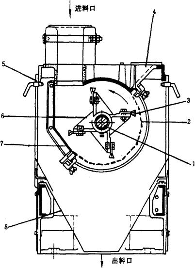 图1-2-26 抛车结构示意图 1-进料斗 2-放料闸门 3-内抛道 4-外抛道 5-挡板 6-隔板 7-出口管道 (7)磁选设备 磁选设备主要是去除磁性金属杂质。按其结构形式分为永磁滚筒和一般磁钢装置。图1-2-27所示为永磁滚筒。工作时,小麦及磁性金属杂质均匀落在磁铁滚筒后,小麦随滚筒转动而下落,从小麦出口5排出。磁性金属杂质被吸在外筒表面,被拨齿带着随筒滚动,一起转到磁场作用区外,自动从磁性金属杂质出口4排出。
