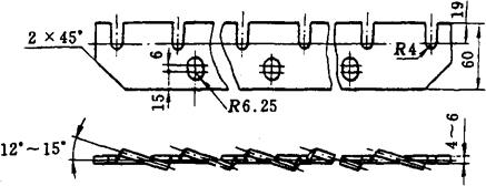 图1-2-43 卧式打麸机 1-主轴 2-半周多边筛 3-可调打板 4-吸风口 5-检查门 6-打板支架 7-缓冲板 8-料斗 打板转子的主轴1一端装有自动调心滚柱轴承和三角带轮,而另一端装在自动调心球轴承上,轴上装有3副十字形打板支架6,其上装有4块打板3。打板形状如图1-2-44所示。它的一侧开有3个腰圆孔,作为连接打板支架及调节打板与半周多边筛2的间距之用。另一侧制成锯齿形,锯齿的扭转角为12°~15°,起打击和推进物料之用。