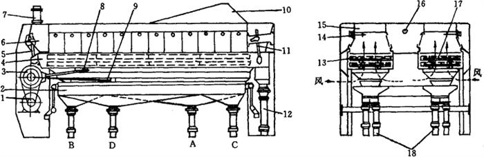 图1-2-45 复式清粉机结构示意图 1-电动机 2-输送槽 3-传动机构 4-筛体 5-前吊杆 6-料流控制器 7-进料口 8-筛体联接架 9-输送槽连接架 10-吸风罩 11-后吊杆 12-筛上物出口 13-筛格 14-风门 15-吸风室 16-采光灯 17-刷子 18-筛下物出口 机架内有2个筛体4,通过2个前吊杆5和1根后吊杆11悬吊在机架上,吊杆垂直方向的倾斜度为5°~15°可调。每个筛体有2层筛格13,每层筛面从进口到出口处分隔为4段,筛孔逐渐加大,并且上层筛面较下层筛面粗,筛体的斜度1~2°。其料流控制器6能根据物料流量大小而自动调节喂料量。该机顶部有纵长的吸风室15通过吸风罩10接在中央吸风系统上。吸风室沿筛面长度分隔为12格,使空气容易分配均匀,每格均设风门14,用以调节每段筛面上吸风的强度,并可借采光灯16观察其工作情况。 工作过程:物料经进料口7,通过料流控制器均匀而连续地送上上层筛面,电动机1带动传动机构3的偏心轴,通过筛体联接架8使筛体作往复运动,物料逐渐向后推移。气流从下方通过筛面,穿透物料,进入吸风罩。在筛体朝后运动时,由于吊杆的倾斜而使筛格上升。而当它朝前运动,即与物料运动方向相反时,吊杆趋于垂直,筛格就降落。筛面的升降结合其倾斜度使物料按需要的速度推进,并使物料松散,空气容易穿过,获得较好的风选效果。物料经上层筛面精选后的筛下物,直接落在下层筛面上再次精选。筛下物进入振动输送槽2,输送槽上装有一排活动隔板,翻动其位置,就能根据需要调节4段筛面筛下物向前或向后送的分界点,使物料分成2~3种等级,送往不同系统处理。而筛上物由另一端的出料口12排出时,还要在吸风道内受到一次风选。因此,物料在重力、气流作用力以及振动筛的影响下,被分离成筛上物、筛下物和吸出物三种不同性质的物料。纯粉粒相对密度较大,沉在下面,首先与筛面接触,按颗粒大小先后穿过筛孔成为筛下物。麦皮和表皮相对密度较小,易被气流吸走,或呈悬浮状态而成筛上物送出。而质量介于纯粉粒与麦皮间的带有麦皮的粉粒,则根据它的颗粒大小和接受风力的不同,被分成筛上物,后部筛下物或吸出物。筛面的清理则是由筛格下部的清理刷子17完成,它随筛体的振动在导杆上运动,刷毛接触筛面,起清理作用。当移动到筛格一端时,受到碰杆的作用,即反向运行,继续清刷筛面。 |