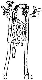 图2-22 韭菜灰霉病病原菌 1.分生孢子 2.分生孢子梗 3.发病条件 病菌生长的温度15~30℃,菌丝生长的适宜温度15~21℃,温度升高时可产生菌核,以菌核越夏。相对湿度95%以上时孢子萌发,但不如在水滴中萌发更好。棚内温湿度条件适宜时,只要有病原菌,病害即可发生。早春低温,高湿,日照不足,是灰霉病发生蔓延的重要条件。据资料报道北京冬季小拱棚韭菜,每年发病初期在1月15~25日(头刀末期),重点为害期在2~3刀韭菜时,如在头刀末二刀初不及时防治,就会造成损失,重者毁棚。一般情况下,小拱棚低,空气对流不畅,相对湿度大,发病重于大棚。连作病重,3年以上的棚韭菜平均病叶率30.62%(24.8%~36%),病指7.93(0.86~18.3),新茬棚韭菜病叶率10.15%(9%~12%),病指1.34(0~3)。韭菜灰霉病发生与刀口有关。头刀韭菜病轻,二、三刀后病情逐渐加重,大、中、小棚韭菜均为同样趋势。品种间的抗病性有明显的差异。河北省主栽品种的抗病性顺序为雪韭>津南青韭>汉中韭>天津黄韭>弯韭。此外,津南青韭、黄苗791、大湾韭等品种比较抗病。 4.防治方法 (1)降湿 适时通风降湿,防止棚内湿度过大。根据天气,中午打开一定量塑料棚通风口。 (2)加强栽培管理 加强水肥管理及中耕,韭菜是多年生蔬菜,因此要增施有机肥,注意合理浇水,增强植株的抗病能力。 (3)清洁棚室 割韭菜后要清除剩下的病叶携出棚室外深埋或烧毁。 (4)药剂防治 头茬韭菜长到3~4厘米时、二茬韭菜在头茬韭菜割后6天左右为防治适期。使用的药剂种类及浓度同黄瓜灰霉病。每公顷喷药量600~750升,重点喷洒新生叶片周围土壤表面,连续喷药2次。第三茬韭菜随气温升高并结合通风晾棚,不需喷药防治。 |