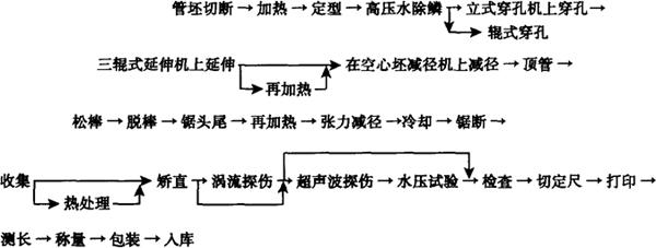 顶管工艺适合于薄壁管的生产,生产规模灵活,技术复杂性较低,产品质量好。其生产工艺流程见图3-11。顶管的生产是用一根芯棒将穿孔(并延伸)后的空心坯一端缩口,同时将下一工序用的芯棒插入,随后在辊式模顶管机上顶出,使其减壁和减径。现代的顶管机采用新式松棒,脱棒机,并配有一座单独传动的24~28个机架的张力减径机。现代的顶管机已成为生产小直径无缝钢管的有效设备。
