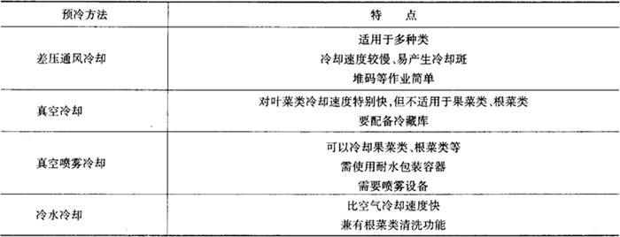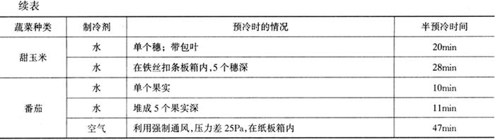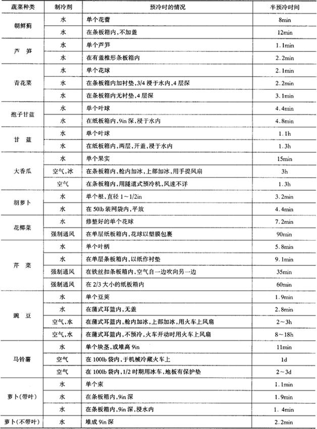 | 释义 | 预冷 预冷是果蔬采后保鲜的一项关键措施。在预冷过程中提高果蔬冷却效率和冷却装置利用率,有助于更好的保持果蔬鲜度,降低冷却费用,提高经济效益。 (一)预冷概述 1.预冷的意义 采后的果蔬仍然是有生命的,不断发生着各种物理的、生理的和生化的变化,而且采后的产品由于其体温很高,这种变化变得更加剧烈,由此降低果蔬的品质、风味和营养成分,促进衰老,造成微生物侵染和腐烂,并大大缩短贮藏和运输期限,增大贮运的风险。延缓这种变化惟一的办法就是采后立即快速地降低果蔬的体温,从而快速抑制呼吸;快速抑制失水;减缓衰老和抑制病原菌和生理病害的发生;减轻冷藏库、冷藏车和冷藏船的制冷负荷及温度波动;提供高质量的果蔬产品,延长贮运期限,降低贮运风险。这在炎热季节和对化学成分变化快、易腐的果蔬尤为重要。采用一些技术措施,使采收后的果蔬快速冷却到接近运输和贮藏要求的温度这一过程叫做预冷。 2.预冷和半冷却时间 目前预冷的方法有水预冷、真空预冷、空气预冷和冰预冷等4类,每一类又有几种形式。评价预冷方式最主要的标准是把一种特定产品降到要求的温度所需要的时间。一般以果蔬产品初始温度与冷却介质(空气、水、冰等)的温差减少到一半所需的时间,即半冷却时间来表达产品降温的速度(见表2-4)。预冷主要用于炎热季节采收的果蔬和特别易腐变质的果蔬。 表2-4 一些蔬菜的半冷却时间(Ryall,1978)