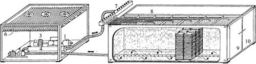 图2-4 活动式水预冷设施(喷淋式)结构简图(Pratella,1977) 1-交流发电机 2-柴油机组 3-压缩机 4-交换器 5-水泵 6-冷凝器 7-收集器 8-带孔槽 9-#处理位置 10-#处理位置