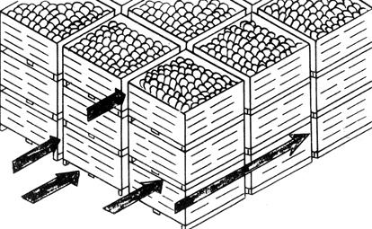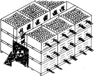 图2-9 房间预冷空气流动示意图(Kader,1992) (2)强制通风(差压)预冷。对包装容器、码垛方式和空气流速有特殊要求。盛装产品的容器要有足够的开孔,码垛要紧密,垛内要留有通道(见图2-10)。采取措施使垛内形成负压,在垛内外之间形成压力梯度,用有一定压力的冷空气从垛外的两侧快速穿过容器内部冷却产品,然后从垛内通道引出。通常使用的流量为0.06m3/(kg·min)。