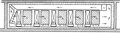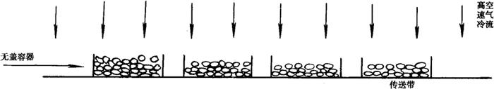 图2-11 快速隧道空气预冷示意图(Thevenot,1955) V-风机 A-果蔬 B-冷源 (4)空气喷射预冷。在隔热的预冷间屋顶安装许多喷嘴,喷嘴以高速吹出冷空气(600~900m/min),从顶向下直接吹到无盖的产品包装容器内。由于这种方法能源消耗大,因此仅用于要求必须在非常短的时间冷却降温的果蔬(见图2-12)。