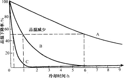 图2-12 空气喷射预冷示意图(Thevenot,1955) 4.加冰预冷 加冰预冷是通过冰的融化,吸收果蔬热量,使果蔬体温快速降低。加冰预冷有时结合运输进行。 (1)接触加冰。一般是在两层果蔬之间加上碎冰,当冰融化时即以相当快的速度使产品温度降低,而融化的冰水则使产品保持新鲜、脆嫩。 (2)包装容器内加冰。某些新鲜果蔬,通常多在产品容器内加入碎冰运输、销售。例如有些甜玉米销售时多在防潮纸袋内加入碎冰。 (3)上部加冰。这种方法一般在运输车辆上完成,即在产品容器上部放碎冰,冰融化,冷却产品。 (三)冷却效率影响因素及其提高对策 1.选择冷却系统的依据 (1)预冷对象的特性。一般根据预冷对象特性的不同,选择不同的冷却方法。一般对水果多采用强制通风预冷,根茎蔬菜多选用水预冷,叶菜以真空预冷或水雾化真空预冷较适宜。由于被预冷对象的大小和密度影响热传导率,因此同一类产品体积小的冷却速度快于体积大的。购置预冷设施的大小(规格型号)和冷却费用,需根据单位时间要求冷却产品的特性和数量的多少来决定。 (2)包装材料和包装容器。包装容器和包装材料对被预冷对象的冷却速率有一定影响,往往有碍于产品的冷却速度和均匀性,进而影响冷却装置的效率。增加容器内包装材料的紧度和厚度(增加内包装和容器衬里等),会使产品冷却效率降低。在包装材料上打孔,可在某种程度上改善产品的冷却速率;但内包装的开孔需与外包装的开孔相配合。码垛和装载形式也影响产品的冷却速率。因此产品在预冷装置内的码垛和装载形式要合理,以尽可能不降低产品的冷却速率为宜。 (3)影响预冷效率的因素。为最有效地使用预冷装置,管理和操作人员应熟悉被预冷产品的特性并熟练掌握所用冷却装置的原理、要求及其特性。首先,要考虑被预冷的产品对介质或预冷方法的敏感性,例如水预冷对樱桃和叶菜有损伤,应正确选择预冷方法。第二,要按每种预冷装置的特点和要求正确操作,以充分发挥其作用。第三,可以将移动式的预冷装置与具有基本制冷能力的冷藏库结合起来,以活动单元增加制冷能力,满足高峰季节预冷作业的需要。另外,通过控制采摘时间和果蔬采后其他散热处理等措施来降低预冷处理前的果蔬田间热,也是一种提高预冷效率的有效方法。 2.预冷装置选择与设计注意事项 (1)预冷类型的选择。可根据需要和不同的预冷产品来选择具有蒸发冷却蛇管的制冷机械,具有加填料的冷水塔、购冰用于房间预冷、强制通风预冷、水预冷或包装加冰、蒸发冷却、真空预冷、差压预冷等,图2-13是不同预冷类型桃的预冷速度比较。