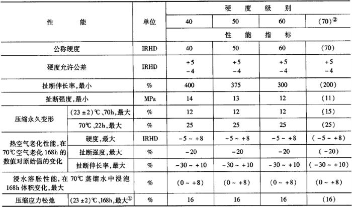 2.硬度分级 以硬度为标志,胶圈分为四个等级,见表7-45在同一胶圈或试件上所测得的硬度值之差,应不超过4IRHD。硬度允许公差见表7-45。 表7-45 橡胶密封圈材料的一般要求