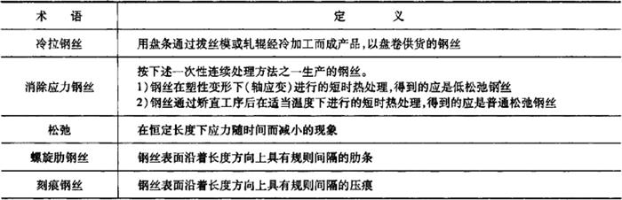 | 释义 | 预应力混凝土用钢丝 1.术语(表5-75) 表5-75 预应力混凝土用钢丝的相关术语