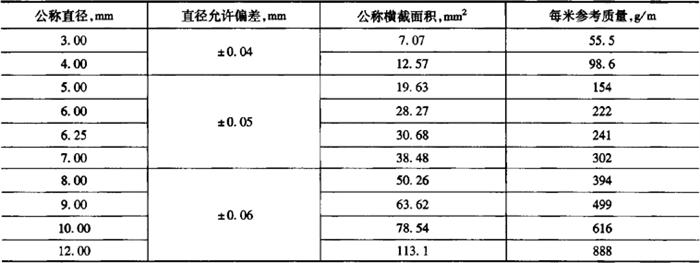 3.尺寸、外形、质量及允许偏差 1)光圆钢丝的尺寸及允许偏差应符合表5-77的规定。每米质量参见表5-77,计算钢丝每米参考质量时钢的密度为7.85g/cm3。 表5.77 光圆钢丝尺寸及允许偏差、每米参考质量