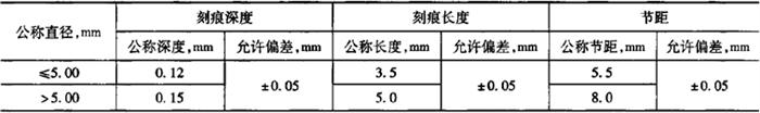 3)三面刻痕钢丝的尺寸及允许偏差应符合表5-79的规定。钢丝的横截面积、每米参考质量与光圆钢丝相同。三条痕中的其中一条倾斜方向与其他两条相反。 表5-79 三面刻痕钢丝尺寸及允许偏差