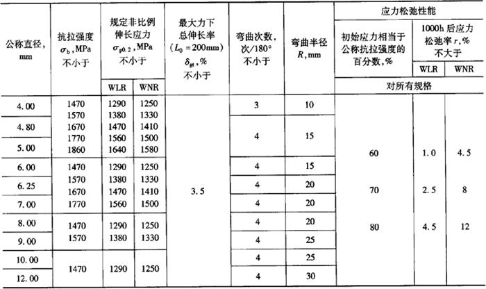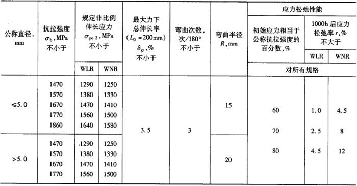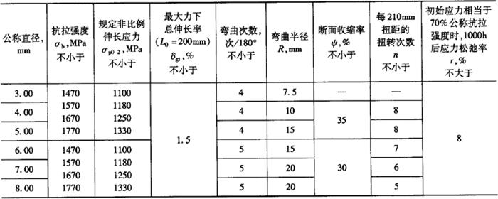 2)消除应力的光圆及螺旋肋钢丝的力学性能应符合表5-81的规定。规定非比例伸长应力σp0.2值对低松弛钢丝应不小于公称抗拉强度的88%,对普通松弛钢丝应不小于公称抗拉强度的85%。 表5-81 消除应力光圆及螺旋肋钢丝的力学性能