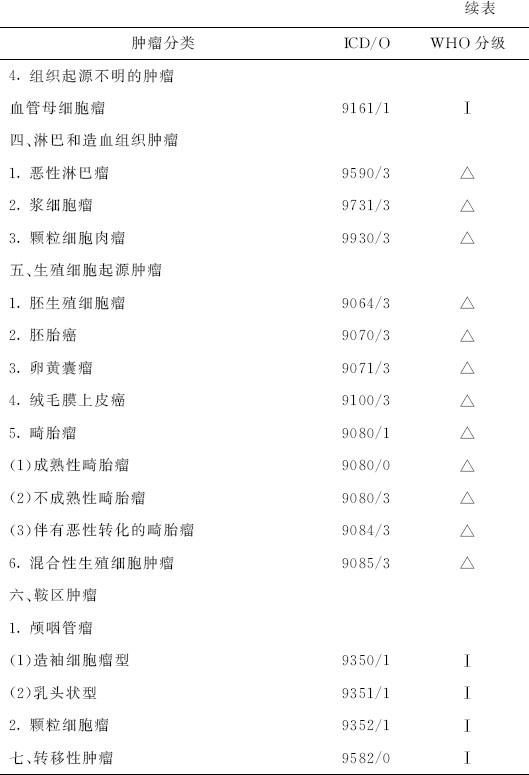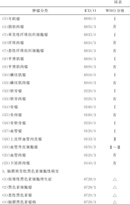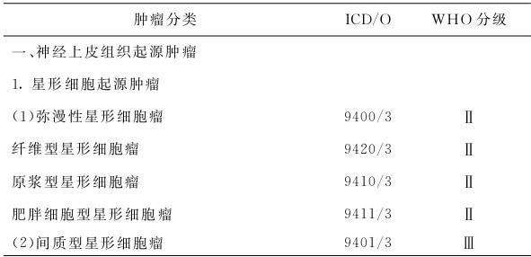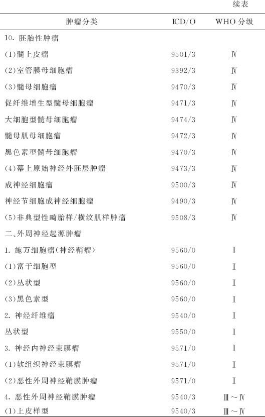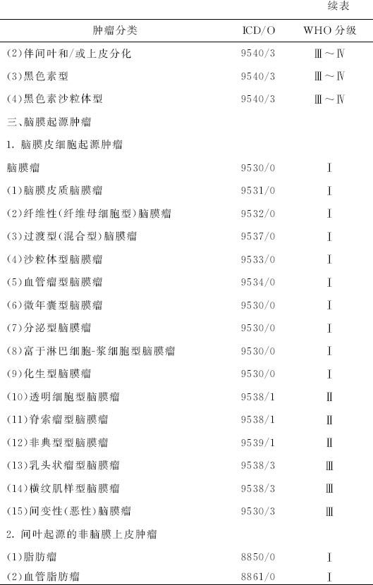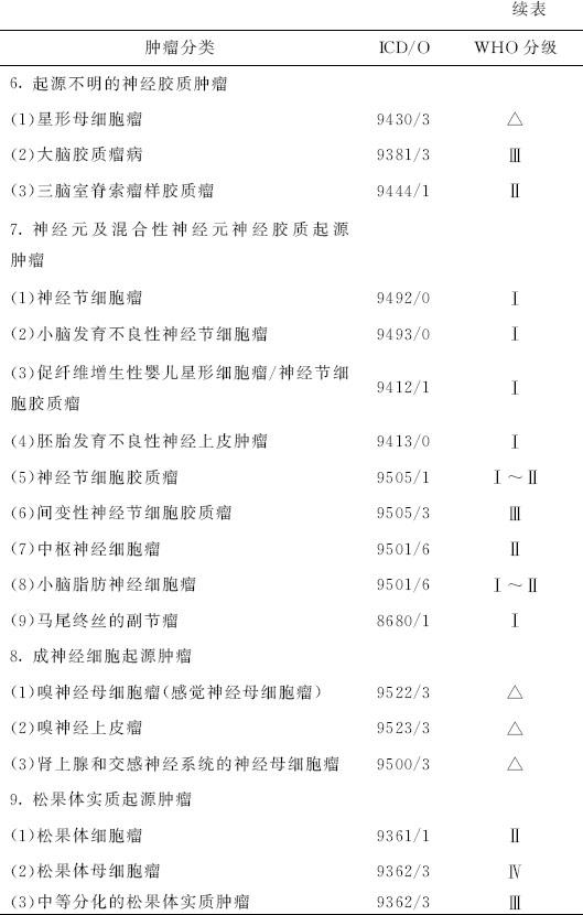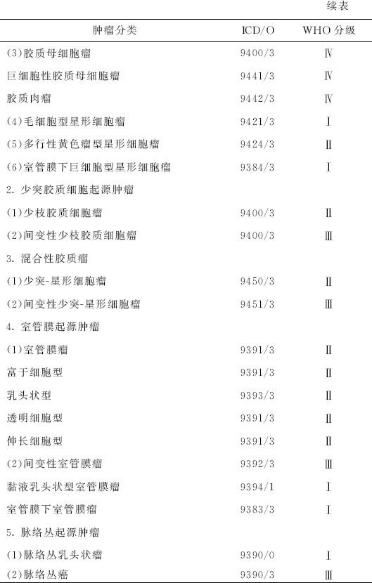 | 释义 | 颅内肿瘤概述 颅内肿瘤(intracranial tumor)可分为原发性和继发性肿瘤两大类。原发性颅内肿瘤发生于脑组织、脑膜、脑神经、垂体、血管及残余胚胎组织等;而继发性肿瘤则是指身体其他部位恶性肿瘤转移或侵入颅内的肿瘤。 一、流行病学 根据调查,原发性颅内肿瘤的发病率为7.8/10万~12.5/10万人。 1.年龄 颅内肿瘤可发生于任何年龄,以20~50岁年龄组多见。①儿童及少年患者以颅后窝及中线部位的肿瘤为多,如髓母细胞瘤、颅咽管瘤及松果体区肿瘤等;②成年患者多为胶质细胞瘤,其次为脑膜瘤、垂体瘤及听神经瘤等。颅内肿瘤在40岁左右成年人为发病高峰期,此后随年龄增长发病率下降;③老年患者胶质细胞瘤及脑转移瘤多见。 2.性别 颅内原发性肿瘤的发生率在性别上无明显差异,男性患者可能略多于女性。 3.部位 其发生部位在小脑幕上与幕下比例约为2∶1。 二、病因 颅内肿瘤的发病原因和身体其他部位的肿瘤一样,目前尚不完全清楚。大量研究表明,细胞染色体上存在着癌基因加上各种后天诱因而使其发生,诱发脑肿瘤的可能因素有:遗传因素、物理和化学因素以及生物因素等。 三、分类 颅内肿瘤的分类曾提出多种多样的方法,各家意见不一。 1.1992年WHO分类和1998年北京神经外科研究所分类介绍如下 (1)神经上皮组织肿瘤:包括星形细胞瘤、少枝胶质细胞瘤、室管膜肿瘤、脉络丛肿瘤、松果体肿瘤、神经节细胞肿瘤、胶质母细胞瘤、髓母细胞瘤。 (2)脑膜的肿瘤:包括各类脑膜瘤、脑膜肉瘤。 (3)神经鞘细胞肿瘤:包括神经鞘瘤、恶性神经鞘瘤、神经纤维瘤、恶性神经纤维瘤。 (4)腺垂体肿瘤:包括嫌色性腺瘤、嗜酸性腺瘤、嗜碱性腺瘤、混合性腺瘤。近年来,根据有无内分泌功能分为功能性和非功能性肿瘤。 (5)先天性肿瘤:包括颅咽管瘤、上皮样囊肿、三脑室黏液囊肿、畸胎瘤、肠源性囊肿等。 (6)血管性肿瘤:包括血管网状细胞瘤。 (7)转移性肿瘤。 (8)邻近组织侵入到颅内的肿瘤包括颈静脉球瘤、同柱细胞瘤、软骨及软骨肉瘤、鼻咽癌、中耳癌等侵入颅内的肿瘤。 (9)未分类的肿瘤。 2.WHO分级标准 (1)Ⅰ级(良性):细胞增生不活跃,无核异型、无核分裂、无血管内皮细胞增生、无坏死。边界清楚易分离,单纯外科手术切除后有被治愈的可能性。 (2)Ⅱ级(亚良性):细胞增生较为活跃,有核异型,但无核分裂、无血管内皮细胞增生、无坏死。呈浸润性生长,手术不易全切除,单纯切除后易复发,部分病例有恶性进展倾向。 (3)Ⅲ级(亚恶性):细胞增生活跃,核异型明显,核分裂多见,无血管内皮细胞增生、无坏死。浸润生长,不易全切,单纯切除后复发间隔短于Ⅱ级,部分病例有恶性进展倾向。 (4)Ⅳ级(恶性):细胞增生极度活跃,核异型更为突出,见较多核分裂和病理性核分裂,有明确的血管内皮细胞增生和/或坏死。浸润性生长能力强,常侵犯邻近脑组织,不易全切。病程进展快,单纯手术切除后复发间隔期少于1年,易在中枢神经系统播散。 3.1999年7月27~30日在法国里昂会议通过,2000年公布的WHO中枢神经系统肿瘤分类见表2-1。 其中ICD/O为肿瘤性疾病国际分类(SNOMED)的形态学编码,“/0”代表良性肿瘤;“/1”代表低或不能肯定或交界性病变;“/2”代表肿瘤;“/3”代表恶性肿瘤。 表2-1 中枢神经系统肿瘤分类(WHO,2000年)
