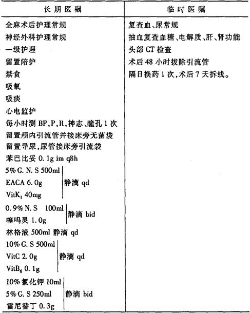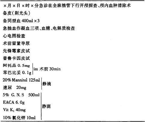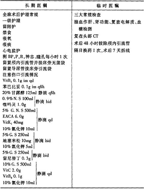 说明:此类病人病情危重,一旦确诊,应紧急开颅手术,应在急诊室初步术前准备后直接送手术室手术。 术后医嘱