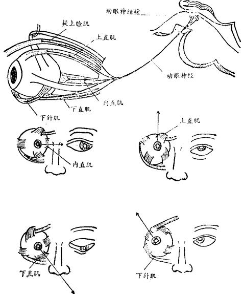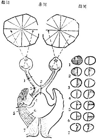 图33 视神经通路及其病灶部所致视野缺损 1.视神经 2.视交叉 3.视交叉周旁 4.视束 5、6.视放射 7.全部视放射 3.眼底检查:是神经系统检查的一部分,在某些疾病的诊疗中,占有重要的地位。因此,熟练地掌握眼底检查是很重要的。眼底检查中,应注意视神经乳头,视网膜血管,黄斑部与视网膜部分。 (1)视神经乳头:形状椭圆或稍圆,直径约1.5厘米,淡红色,边沿清楚,其外缘有白色的巩膜环。视网膜血管出入视神经乳头处,表面形成一凹陷,称为生理凹陷,位置多偏于颞侧,其中央有灰色斑点,称筛板。 (2)网膜血管:从视神经乳头分出后,鼻上、鼻下支分布走向鼻侧上、下方;颞上、颞下支分布走向颞上、颞下方。 正常动脉较静脉细,比例约为2:3,动脉色较静脉浅。 (3)黄斑部:位于视神经乳头颞侧稍下方,距神经乳头外沿约1.5~2个视乳头直径处,色深红、点状,有明显的反光。 (4)视网膜:除视神经乳头外,全部眼底皆为浅橘红颜色。 (三)动眼、滑车、外展神经:检查眼裂大小,眼球有无内陷或外突,瞳孔的大小、形状、直接、间接光反射,调节反射,眼球向上、下、内、外等各方向的运动,有无同向偏斜与眼球震颤(水平性,垂直性,旋转性,向何侧出现,其快慢方向等),辐凑运动有无障碍,有无复视等(图34、35、36、37)。